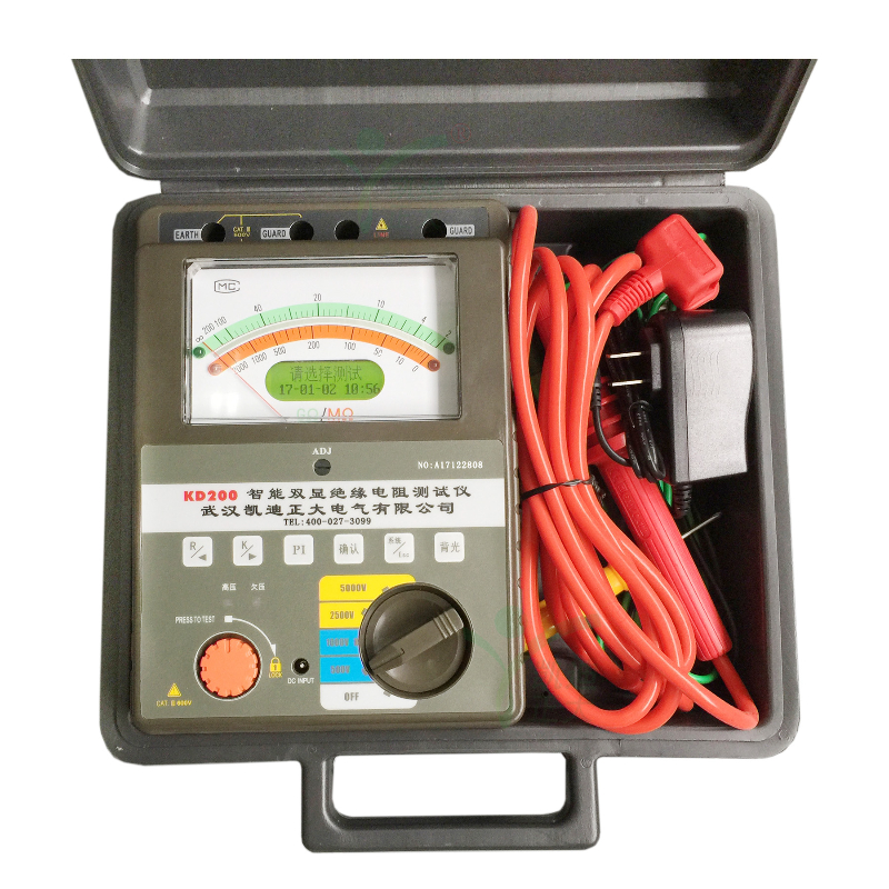 武漢凱迪正大電氣有限公司專業(yè)生產(chǎn)的KD200系列型智能雙顯絕緣電阻測(cè)試儀采用嵌入式工業(yè)單片機(jī)實(shí)時(shí)操作系統(tǒng),薄形張絲表頭與圖形點(diǎn)陣液晶顯示器較好結(jié)合,KD200系列表具有多種電壓輸出等級(jí)(500V、1000V、2500V、5000V)、容量大、抗干擾強(qiáng)、指針與數(shù)字同步顯示、交直流兩用、操作簡(jiǎn)單、自動(dòng)計(jì)算各種絕緣指標(biāo)(吸收比、極化指數(shù))、各種測(cè)量結(jié)果具有防掉電功能等特點(diǎn)。是測(cè)量大容量變壓器、互感器、發(fā)電機(jī)、高壓電動(dòng)機(jī)、電力電容、電力電纜、避雷器等絕緣電阻的測(cè)試儀器。