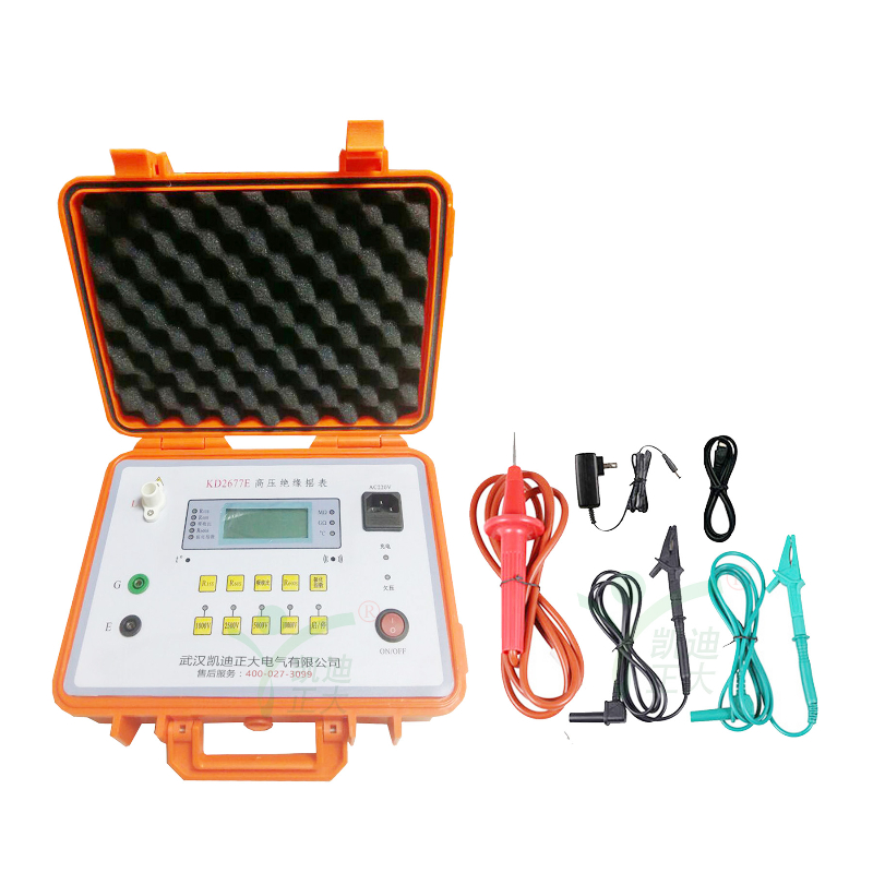 KD2677E高壓絕緣搖表采用高壓逆變電路將DC供電逆變?yōu)轭~定高壓輸出1000V、2500V、5000V,,10000V施加到被測試品兩端,采用了電壓、電流采樣電路,將采樣被測試品兩端的電壓和