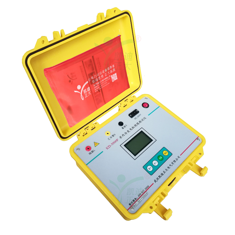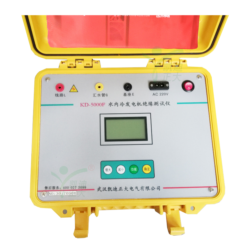 KD5000F水冷發(fā)電機(jī)絕緣電阻測試儀專用于水內(nèi)冷發(fā)電機(jī)的絕緣測量試驗(yàn),同時也可用于試驗(yàn)室或現(xiàn)場做其它材料的絕緣測試,輸出電流大于40mA。輸出電壓最大5000V,可測高達(dá)100GΩ的絕緣電阻。內(nèi)含高精度微電流測量系統(tǒng)、數(shù)字升壓系統(tǒng)。只需要用一條高壓線和一條信號線連接試品即可測量。測量自動進(jìn)行,結(jié)果由大屏幕液晶顯示,并將結(jié)果進(jìn)行存儲。不需對水極化電勢進(jìn)行補(bǔ)償調(diào)節(jié),機(jī)座與匯水管間的電阻小至3kΩ,也可保證測量準(zhǔn)確度,水阻大于80kΩ時,可保證測試準(zhǔn)確度。并自動計(jì)算吸收比(R60S/R15S)和極化指數(shù)(R10min/R1min),自動儲存15秒、1分鐘、10分鐘的絕緣電阻值。也可用于變壓器等其他電力設(shè)備的絕緣電阻測試。