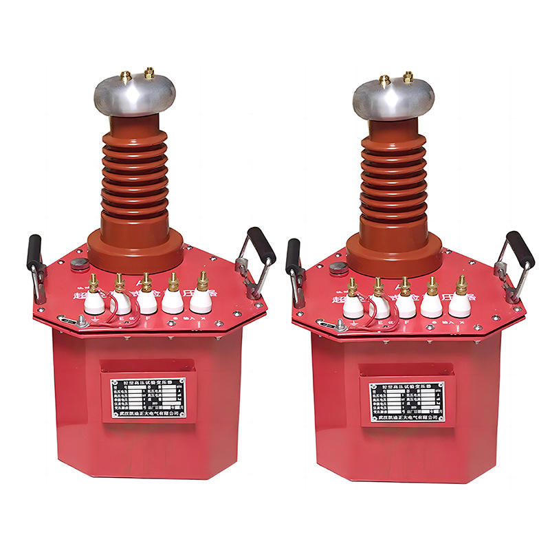 超輕型試驗變壓器為戶內式設備,鐵芯采用優(yōu)質冷軋取向硅鋼片,結構為芯式、橫式放置,芯柱上同心地裝有低壓繞組、測量繞組、屏蔽、高壓繞組。高壓繞組為多層寶塔式梯形結構、低壓繞組為圓筒式結構,屏蔽連同鐵芯一起接地。油箱底部設有移動腳輪(5kVA以下無腳輪),可在地面實時移動,便于實驗室和野外現(xiàn)場作業(yè)。