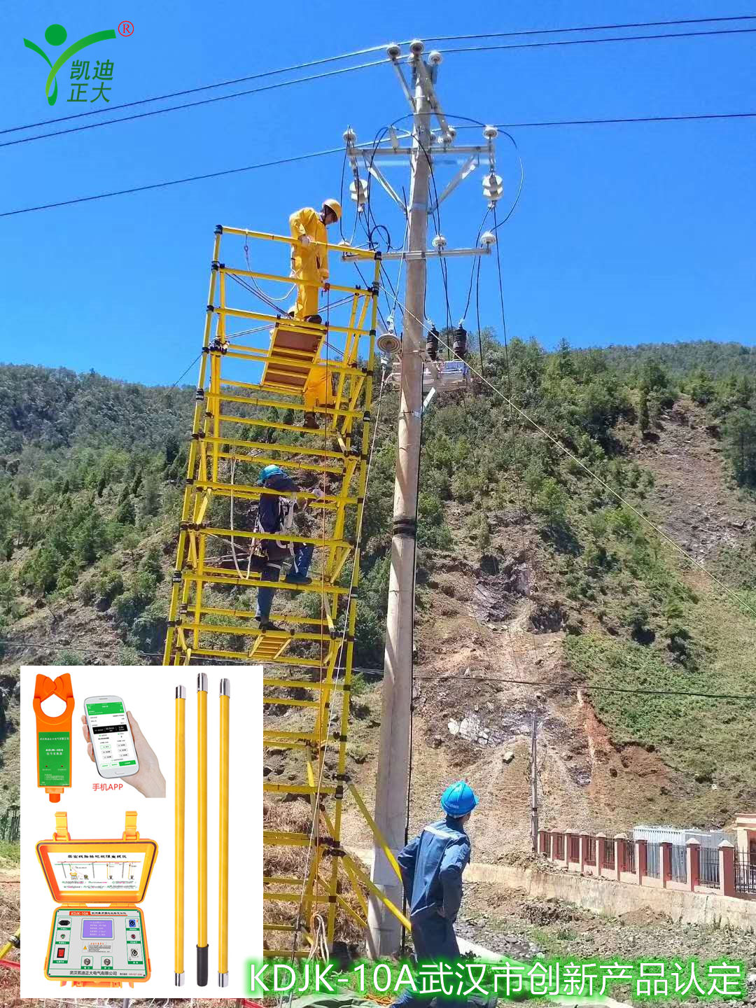 首先將故障線路的開關(guān)斷開;使用KDJK-10A測(cè)試地線用接地線與接地棒連接,接地棒接入大地網(wǎng);信號(hào)輸出端子與高壓輸出測(cè)試線插頭端子連接,其另一端的線鼻子壓擰在接在絕緣掛線桿的蝴蝶母接線柱上,3根絕緣桿用短接線連接,再將掛線桿掛在故障線路上。