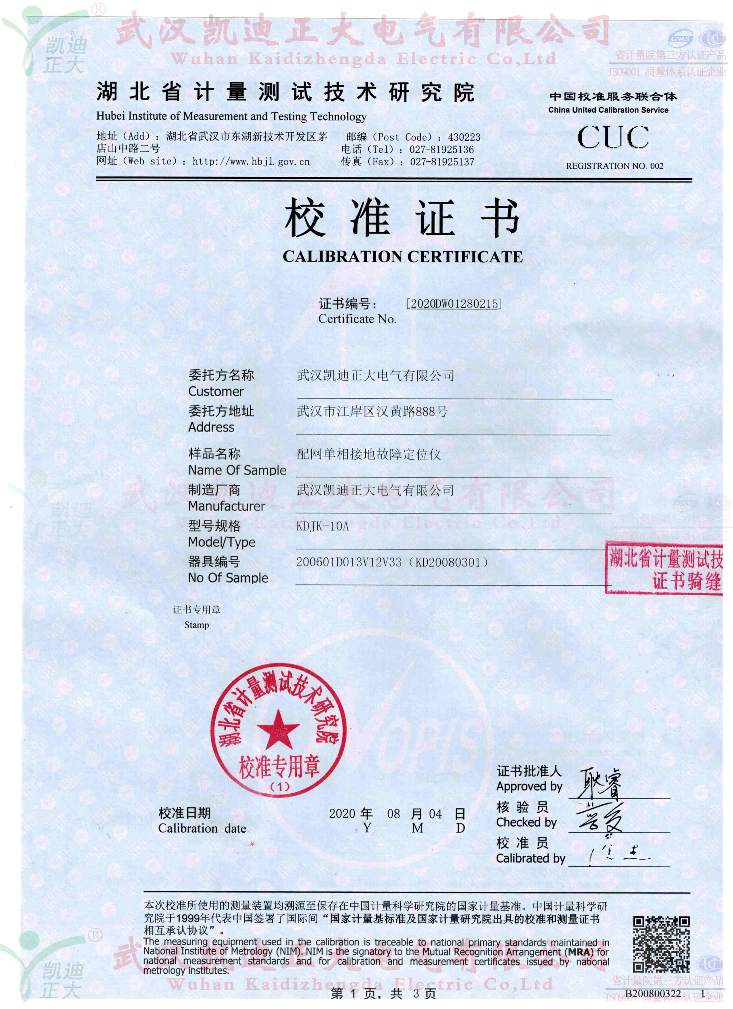 我司抽檢10套10kV配網(wǎng)單相接地故障定位儀送往湖北省計量測試技術(shù)研究院校準,獲得電學所檢測設(shè)備DS0S054A數(shù)字示波器標準設(shè)備的數(shù)據(jù):輸出波形正玄波、異頻信號21.598Hz、輸出電壓8.603kV、頻率測量的不確定度0.006%。符合武漢凱迪正大公司和國家電力規(guī)程標準。