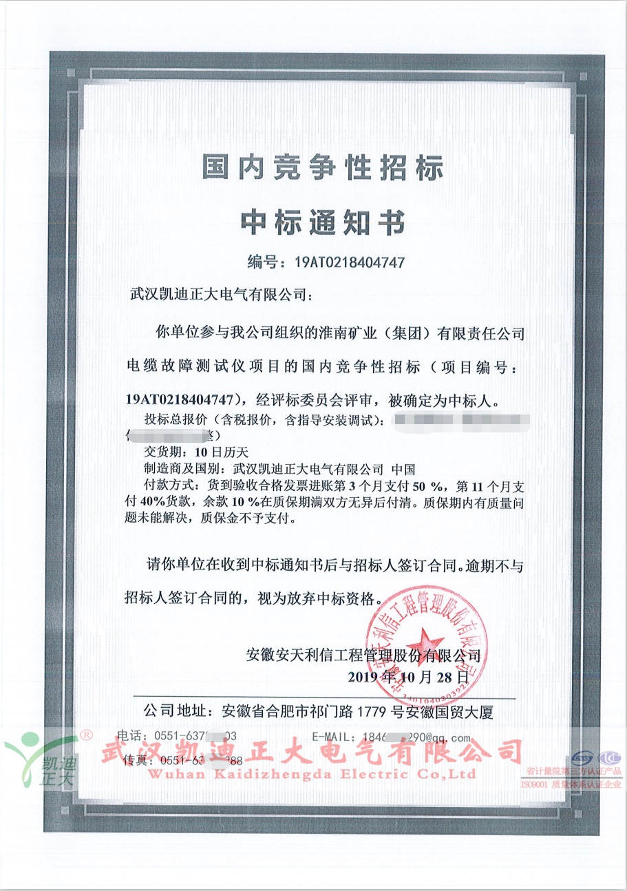 金九銀十,黃金節(jié)。武漢凱迪正大電氣公司參與淮南礦業(yè)(集團(tuán))有限責(zé)任公司電纜故障測(cè)試儀項(xiàng)目投標(biāo),在經(jīng)過(guò)嚴(yán)正的評(píng)標(biāo),最終確認(rèn)武漢凱迪正大電氣有限公司為第一中標(biāo)人。