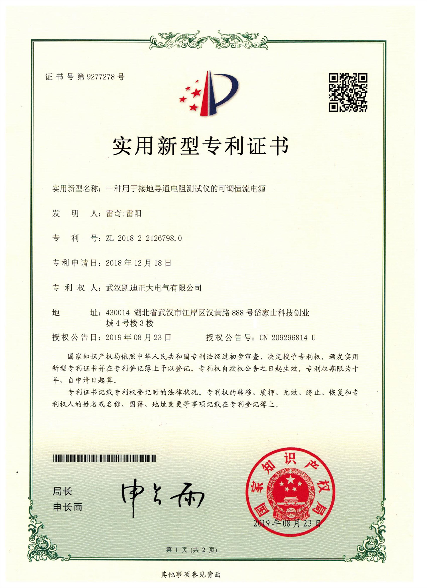 KDDT-10A接地引下線導通測試儀專利,一種用于接地導通電阻測試儀的可調(diào)恒流電源,證書號第:9277278號。專利號:ZL 2018 2 2126798.0 專利權人:武漢凱迪正大電氣有限公司