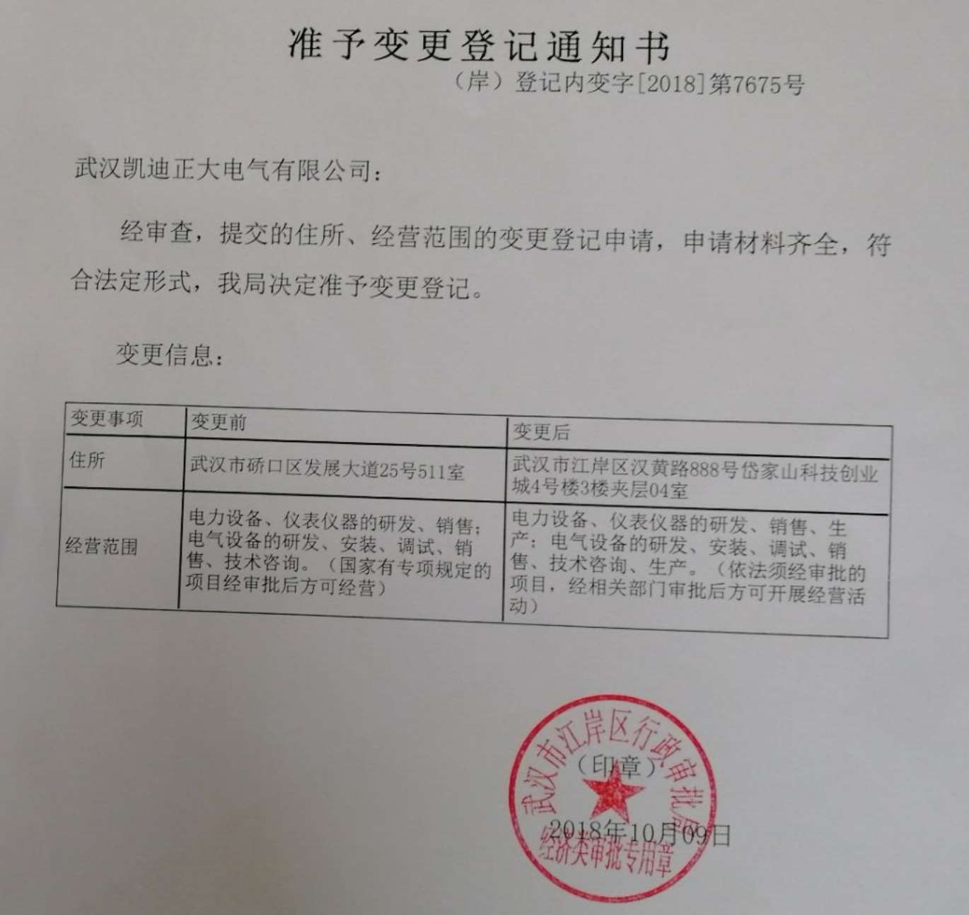 變更后:武漢市江岸區(qū)漢黃路888號岱家山科技創(chuàng)業(yè)城4號樓3樓夾層04室 經(jīng)營范圍:電力設(shè)備、儀表儀器的研發(fā)、銷售、生產(chǎn);電氣設(shè)備的研發(fā)、安裝、調(diào)試、銷售、技術(shù)咨詢、生產(chǎn)。(依法須經(jīng)審批的項(xiàng)目,經(jīng)相關(guān)部門審批后方可開展經(jīng)營活動)