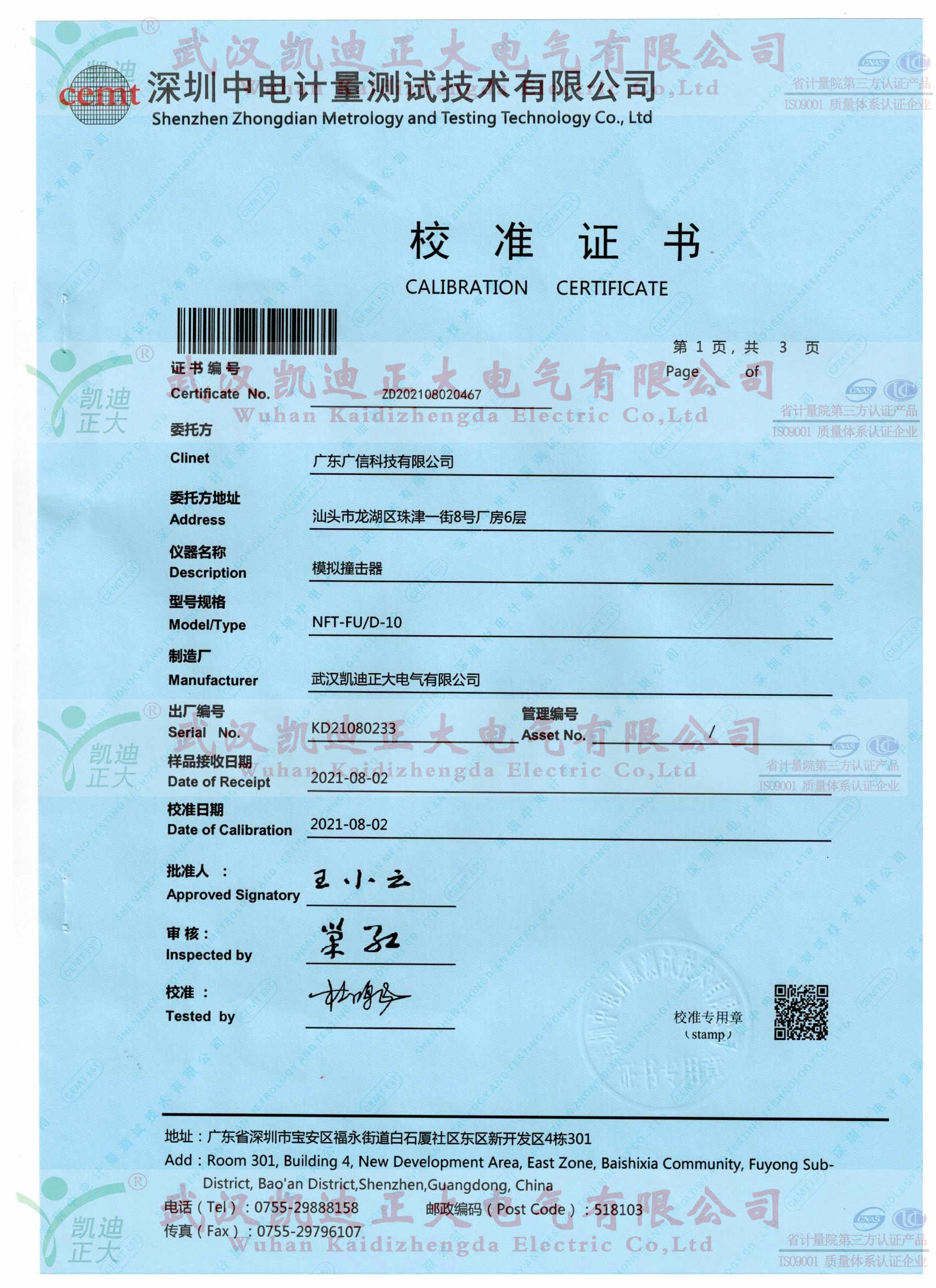 隨著汕頭市廣信電氣設(shè)備有限公司的業(yè)務(wù)增加、產(chǎn)品形象定位精準(zhǔn)得到市場(chǎng)的認(rèn)可,更名廣東廣信科技有限公司。一直堅(jiān)持“誠(chéng)實(shí), 守信”的經(jīng)營(yíng)理念,采購國(guó)內(nèi)著名品牌產(chǎn)品用于生產(chǎn)成套設(shè)備,高效率的檢測(cè)設(shè)備。這次采購的NFT-FUD-10交流高壓負(fù)荷開關(guān)模擬撞擊器用于熔斷器撞擊器動(dòng)作試驗(yàn)。NFT-FUD-10獲得中良計(jì)量模擬裝擊器校檢報(bào)告。