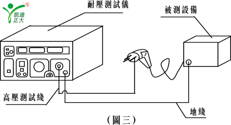 按圖三將耐壓儀與被測整機(jī)連接,接通被測整機(jī)電源開關(guān),根據(jù)被測整機(jī)產(chǎn)品標(biāo)準(zhǔn)設(shè)置漏電流報警值,然后再按4條或5條所進(jìn)行測試。如若被測整機(jī)產(chǎn)品標(biāo)準(zhǔn)沒有規(guī)定具體漏電流報警值,則推薦按下式計算:Iz=Kp(U/R)...............(1)