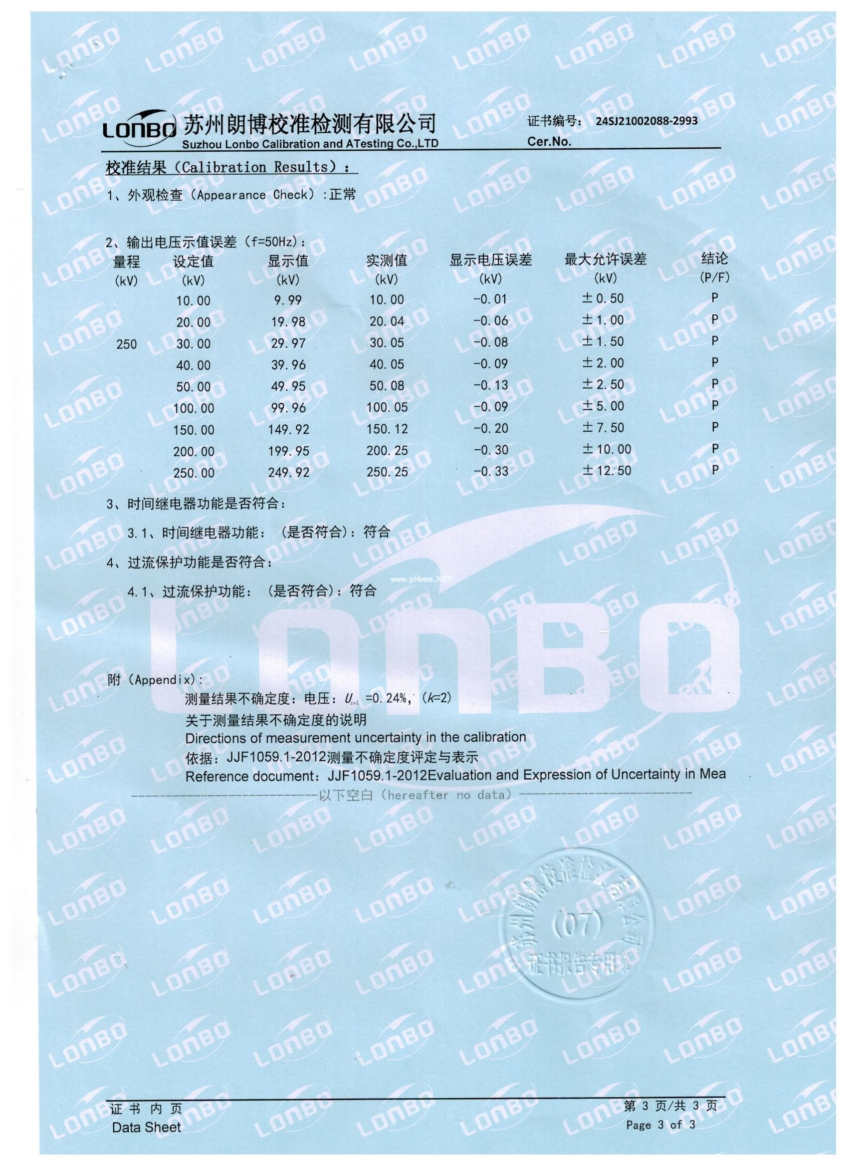 工頻耐壓試驗(yàn)裝置,并由甲方委托蘇州朗博校準(zhǔn)檢測(cè)有限公司出具檢測(cè)報(bào)告。
