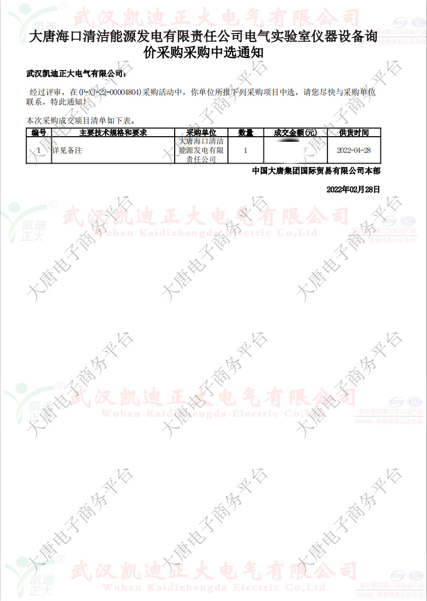 遲日江山麗,春風(fēng)花草香。祝賀我司商務(wù)部再次接到中國大唐海口清潔能源發(fā)電有限責(zé)任公司電氣實驗室儀器設(shè)備詢價采購采購中選通知。