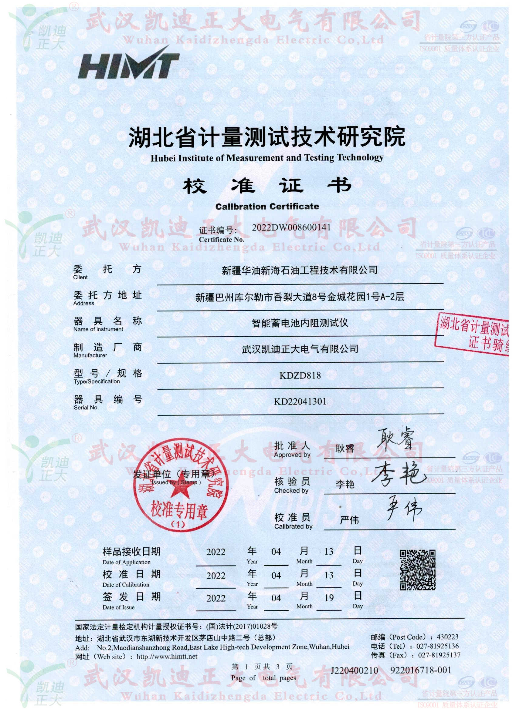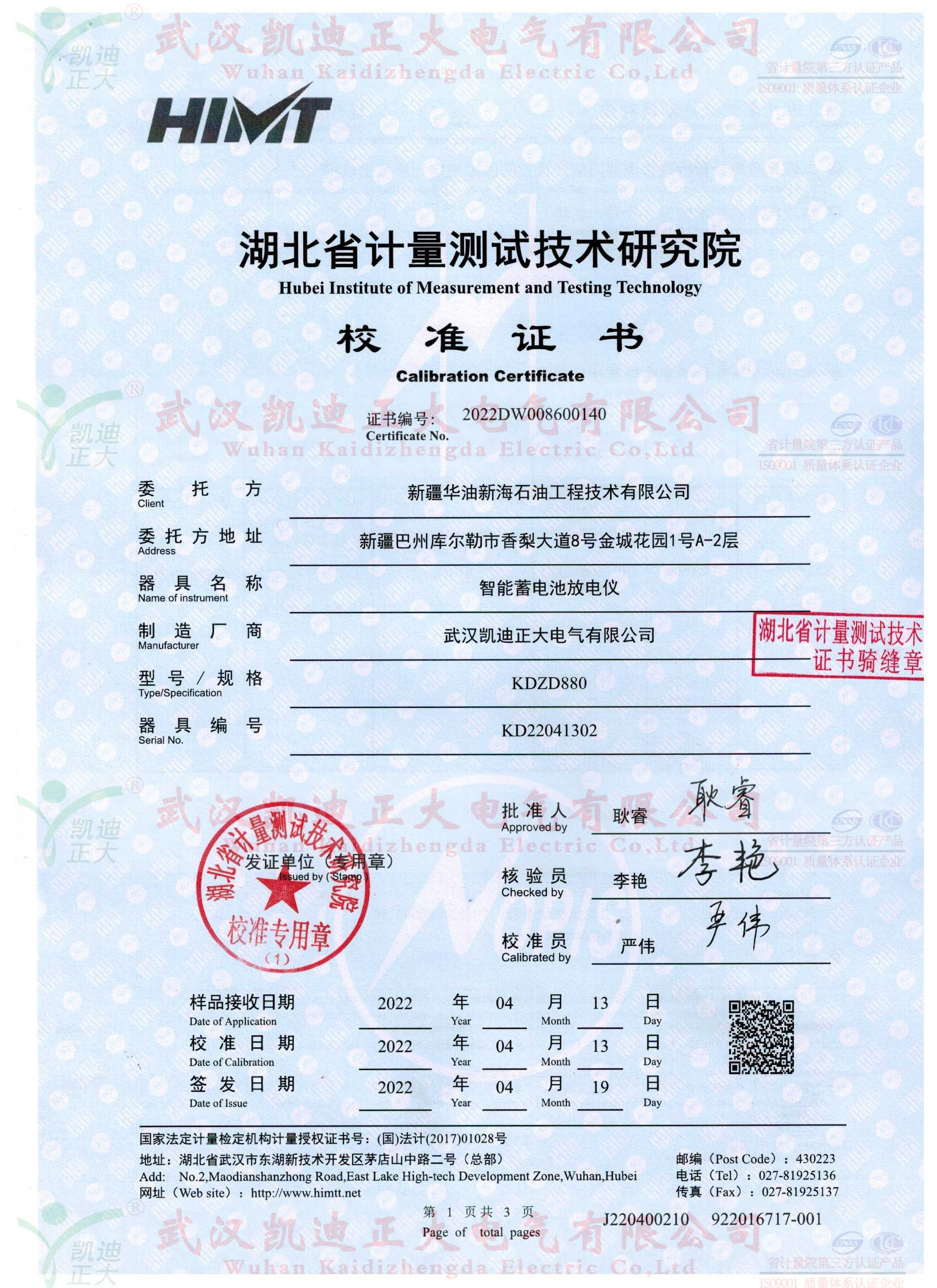 今年3月份,新疆華油工程部劉工致電我司。吐槽之前買的一批揚(yáng)州某公司設(shè)備,使用不是很理想。這次選擇我們的KDZD818智能蓄電池內(nèi)阻測(cè)試儀、KDZD882智能蓄電池放電監(jiān)測(cè)儀等設(shè)備。話說“一朝被蛇咬十年怕井繩”,這次購(gòu)買設(shè)備還是對(duì)比武漢幾家企業(yè)后綜合售后服務(wù)、品牌力、設(shè)備性能對(duì)比選擇我司,簽署技術(shù)協(xié)議并要求獲得湖北省計(jì)量測(cè)試技術(shù)研究院檢定報(bào)告,對(duì)于這些常規(guī)要求,我司幾乎有實(shí)力、有信心能夠獲得計(jì)量證書。