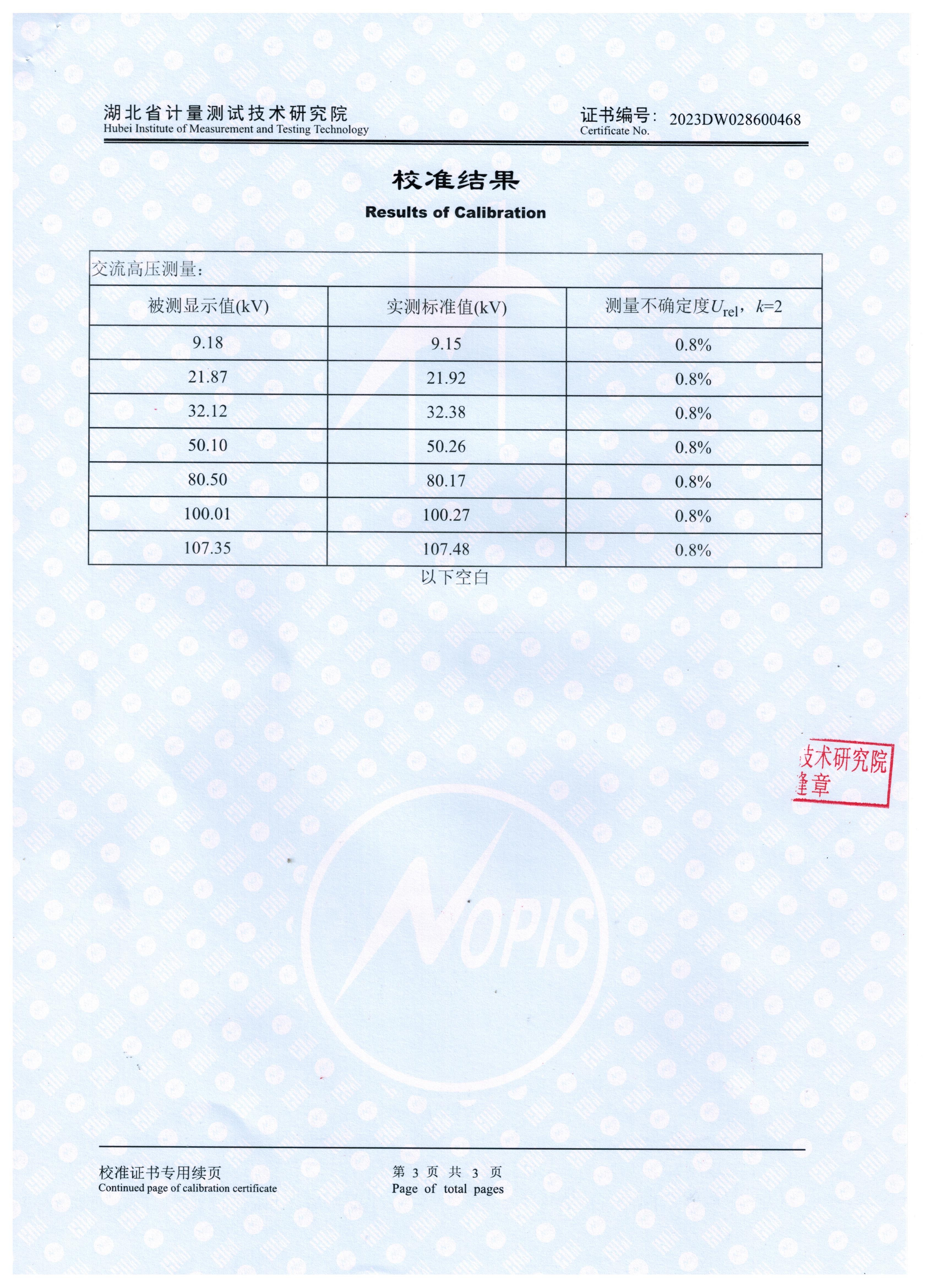 參照 JJG(浙)1144-2018《交流高壓試驗裝置校準規(guī)范》 檢定要求,KDXZ-II-108kVA/108kV 變頻串聯(lián)諧振試驗裝置獲得2023DW028600468檢定證書。