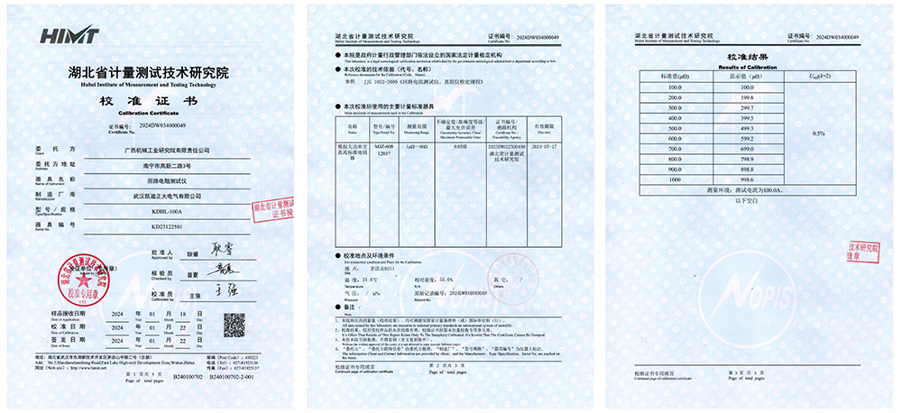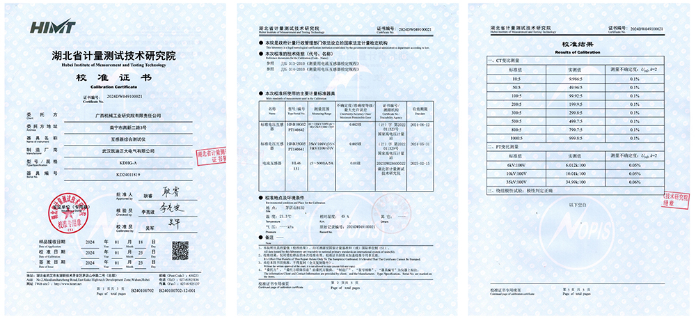 2024年1月22日,廣西機械工業(yè)研究院有限責任公司采購武漢凱迪正大的KDHG-A 互感器綜合測試儀 、KDHL-100A 回路電阻測試儀、KDJB-702C 微機繼電保護測試儀等電力儀器儀表,通過了湖北省計量測試技術研究院的嚴格校準。武漢凱迪正大作為電力儀器儀表的供應商,先后為國內(nèi)外多家企業(yè)提供所需的的試驗設備,產(chǎn)品在行業(yè)內(nèi)受到廣泛好評和推崇。