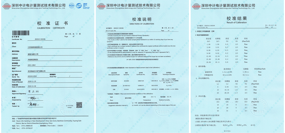 江蘇某電器有限公司采購武漢凱迪正大電氣有限公司的KDCJ-20kV沖擊耐壓測試儀、KDYD-FD放電試驗(yàn)裝置、KDYD-ZY噪聲測試平衡負(fù)載系統(tǒng)、KD-IP2C防護(hù)等級(jí)試驗(yàn)棒,通過深圳中計(jì)電計(jì)量測試技術(shù)有限公司的校準(zhǔn),并拿到校準(zhǔn)報(bào)告。