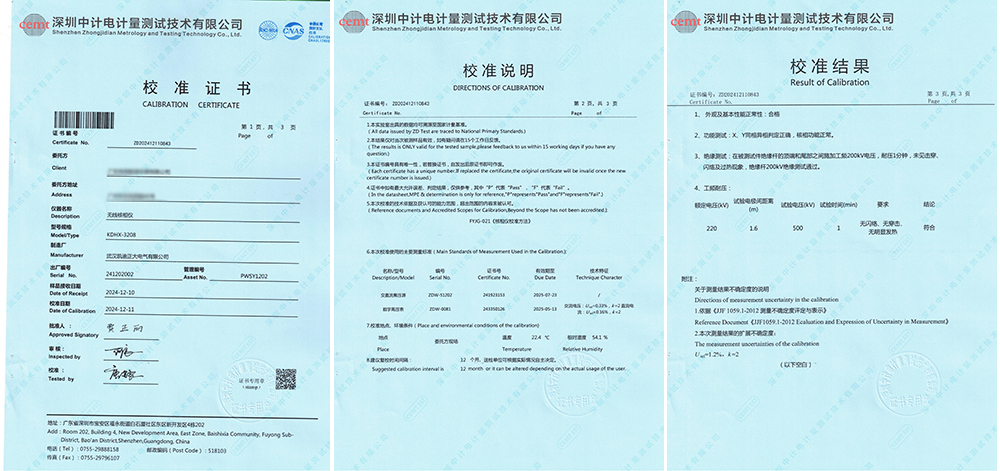 近日,廣東某能源發(fā)展有限公司訂購我司的KDHX-3208無線核相儀順利通過了深圳中電計(jì)量測(cè)試技術(shù)有限公司的專業(yè)校準(zhǔn),獲得校準(zhǔn)證書。