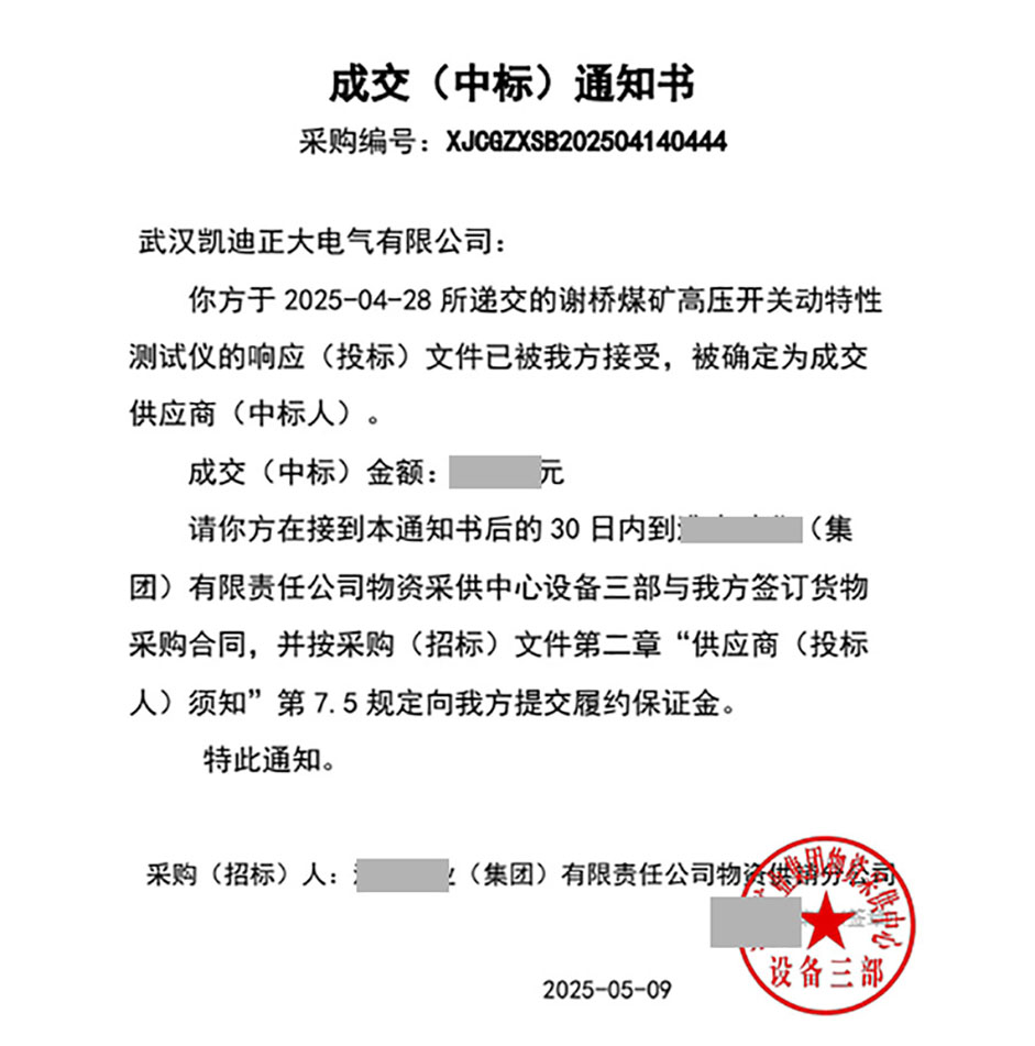 恭喜武漢凱迪正大成功中標(biāo)淮南某集團(tuán)高壓開關(guān)動(dòng)特性測試儀項(xiàng)目