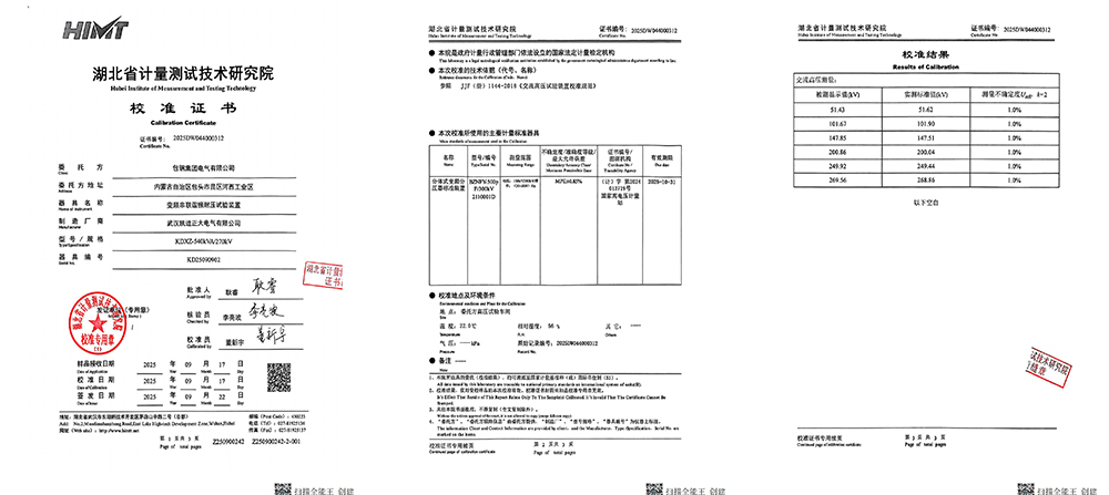 在電力設(shè)備制造與運(yùn)維領(lǐng)域,高壓耐壓試驗(yàn)是確保輸變電設(shè)備安全可靠運(yùn)行的關(guān)鍵環(huán)節(jié)。變頻串聯(lián)諧振耐壓試驗(yàn)裝置因其輸出波形純凈、效率高、對(duì)試品損傷小等優(yōu)勢(shì),已成為高壓試驗(yàn)的常用設(shè)備。近期,包鋼集團(tuán)電氣有限公司從武漢凱迪正大電氣有限公司采購(gòu)了兩套型號(hào)為KDXZ-540kVA/270kV的變頻串聯(lián)諧振耐壓試驗(yàn)裝置,湖北省計(jì)量測(cè)試技術(shù)研究院對(duì)其進(jìn)行校準(zhǔn)。2025年9月,兩套裝置均順利通過(guò)校準(zhǔn),獲得證書(shū)編號(hào)分別為2025DW044000312和2025DW044000311的校準(zhǔn)證書(shū)。