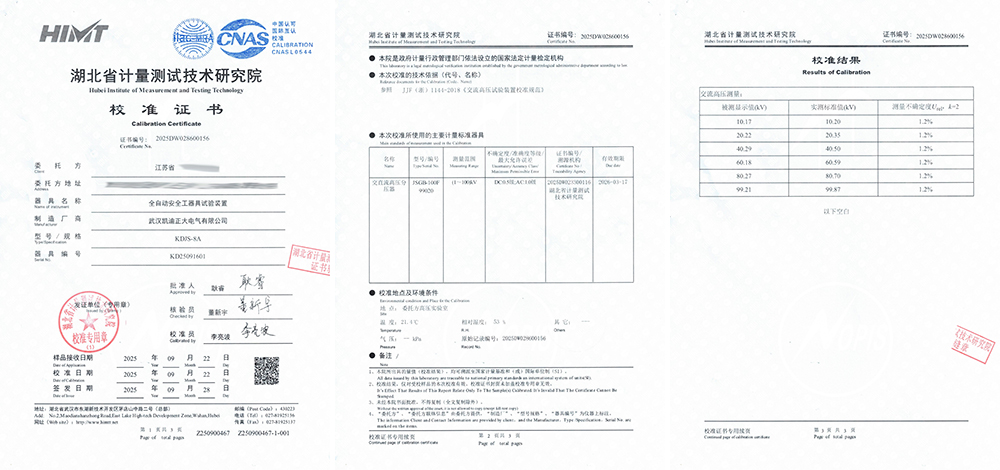 江蘇某灌溉單位采購(gòu)武漢凱迪正大KDJS-8A型全自動(dòng)安全工器具試驗(yàn)裝置,經(jīng)湖北省計(jì)量測(cè)試技術(shù)研究院嚴(yán)格校準(zhǔn),取得了編號(hào)為2025DW028600156的校準(zhǔn)證書(shū)。