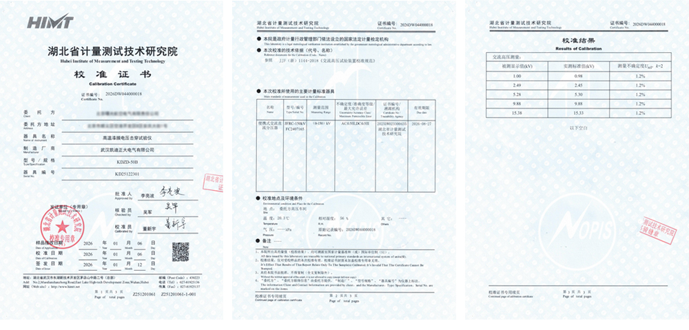整體性能可靠:數(shù)據(jù)表明,KDZD-50B型試驗儀在其量程范圍內(nèi),測量結(jié)果準確、穩(wěn)定,系統(tǒng)誤差小,具備了為高端絕緣材料測試提供可靠數(shù)據(jù)的能力。湖北省計量測試技術研究院出具的校準證書確認,該臺KDZD-50B高溫漆膜電壓擊穿試驗儀的交流高壓測量功能符合預期使用要求,量值準確可靠。
