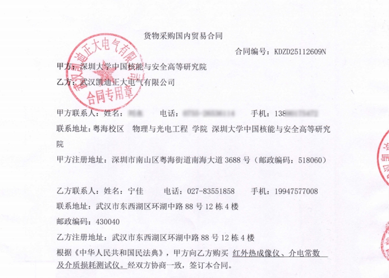 近日,深圳大學中國核能與安全高等研究院正式采購了武漢凱迪正大電氣有限公司的KDRX-2581紅外熱成像儀與KDYD-JZ介電常數(shù)及介質(zhì)損耗測試儀,合同編號KDZD25112609N。